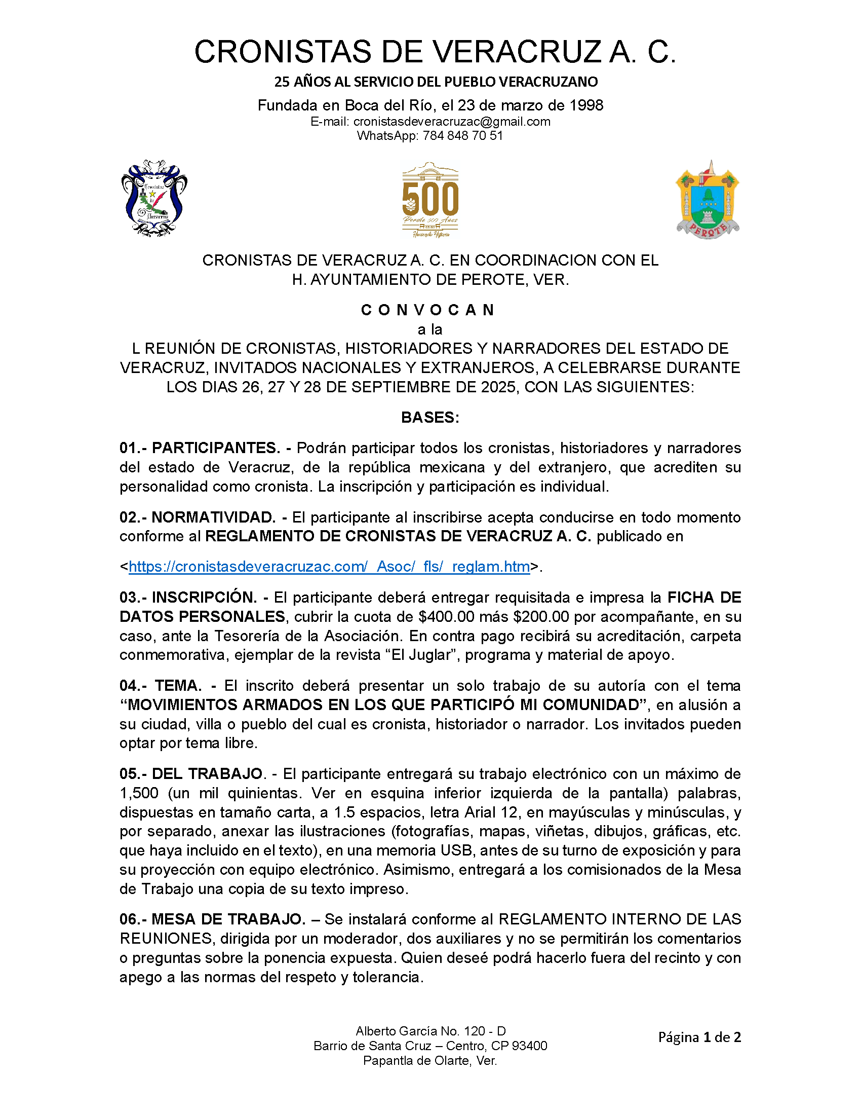 Fundada en Boca del Río, el 23 de marzo de 1998 L REUNIÓN DE CRONISTAS DE VERACRUZ, HISTORIADORES, RELATORES E INVITADOS NACIONALES Y EXTRANJEROS.TEMA: “MOVIMIENTOS ARMADOS EN LOS QUE PARTICIPÓ MI COMUNIDAD”Cronistas de Veracruz A. C., y el H. Ayuntamiento Constitucional de Perote, en el marco de la celebración de los 500 años de su fundación, convoca a los cronistas, historiadores, relatores, del Estado de Veracruz, de la República Mexicana y extranjeros, a participar en suL Reunión, a celebrar los días 26, 27 y 28 de septiembre de 2025.CONVOCATORIA E INFORMACIÓN GENERAL